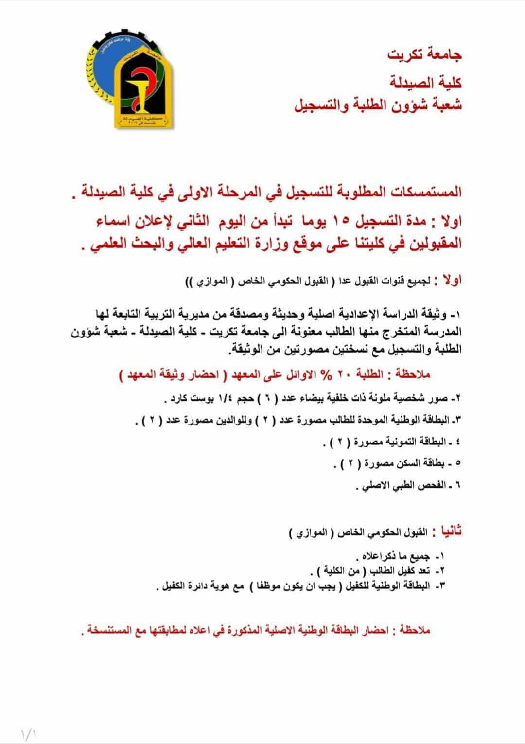 تأسست كلية الصيدلة في جامعة تكريت منذ عام 2002 حيث صدر أمر جامعي من رئاسة جامعة تكريت باستحداث هذه الكلية بالرقم 1س/522 في 27/6/2002، وشُكِّلت لجنة لتهيئة مستلزمات استحداث الكلية حسب الأمر الجامعي 7/18/71 في 20/1/2002، وأعدّت هذه اللجنة التقرير الخاص باستحداث الكلية متضمنًا أهداف الكلية وخطة القبول والمستلزمات البشرية والملاك الفني والإداري والمناهج الدراسية وكيفية توفير الكتب المجانية والمصدرية والمستلزمات العلمية والمادية وتصاميم الكلية واحتياجاتها من الأبنية والقاعات والمختبرات وغرف التدريسيين والإداريين.