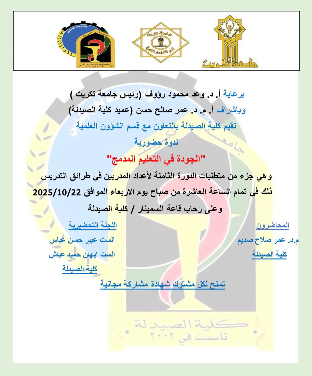 انطلقت صباح اليوم الاثنين الموافق 2025/10/27 في كلية الصيدلة – جامعة تكريت، أعمال الدورة التدريبية الحضورية...