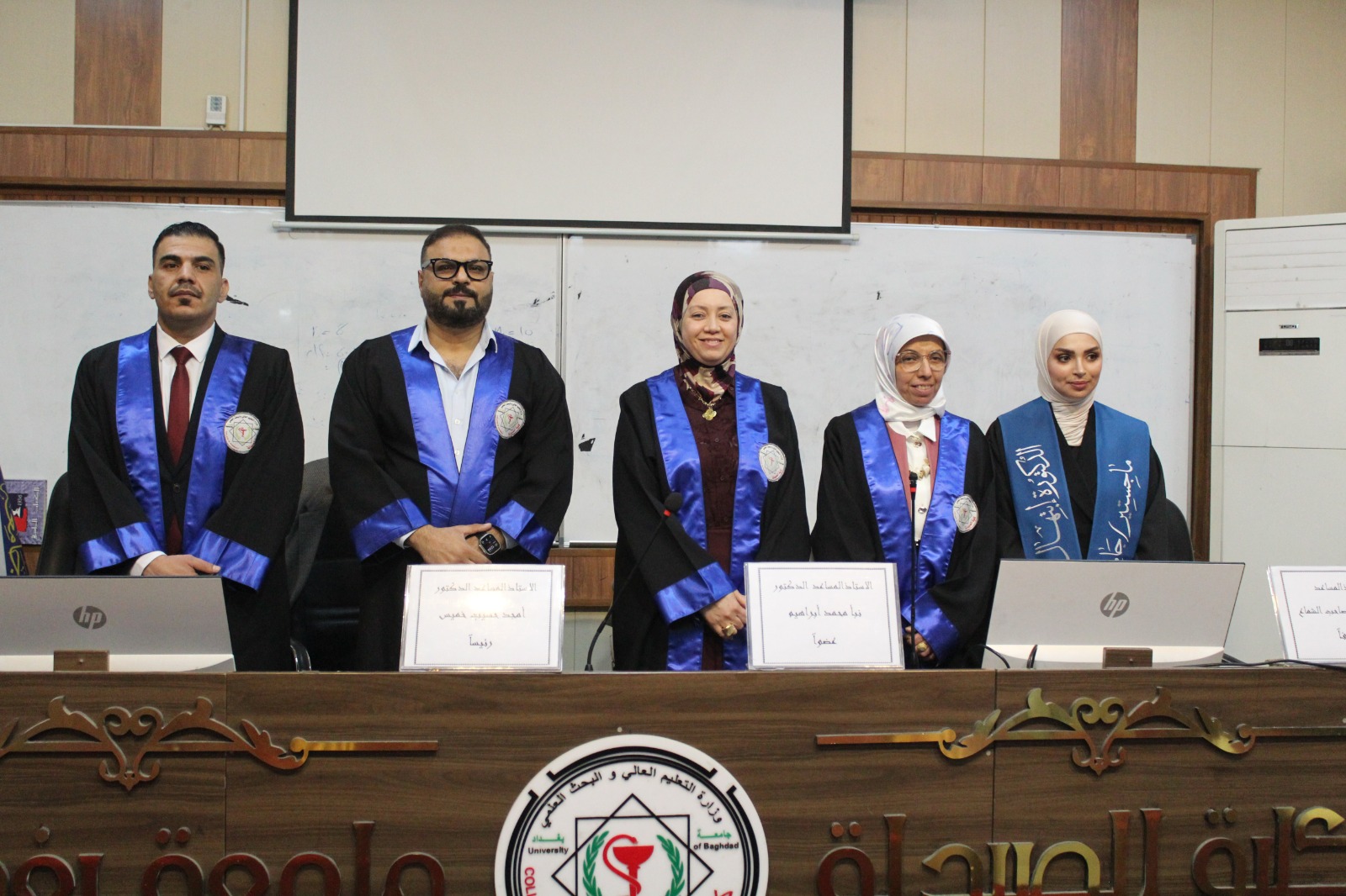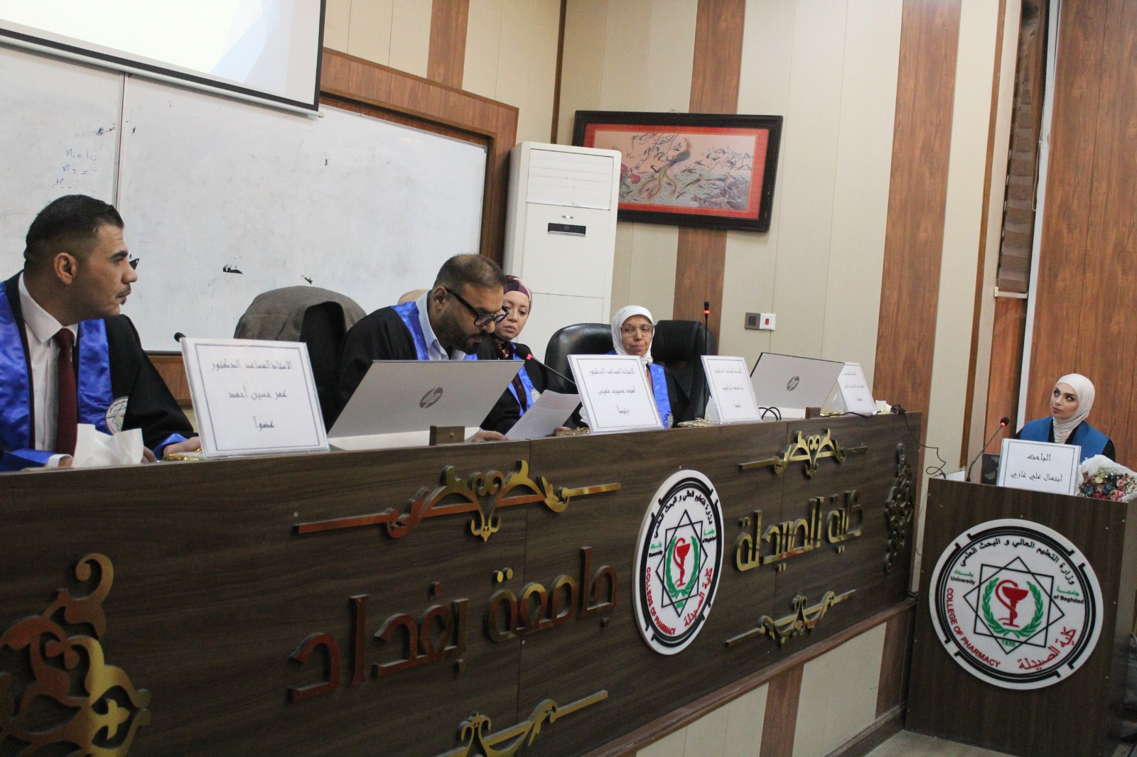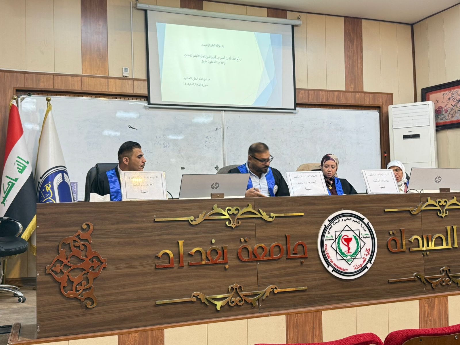 وقد أجريت المناقشة في تمام الساعة التاسعة من صباح يوم الاثنين الموافق 2026/2/23، على قاعة الرازي في كلية الصيدلة جامعة بغداد.