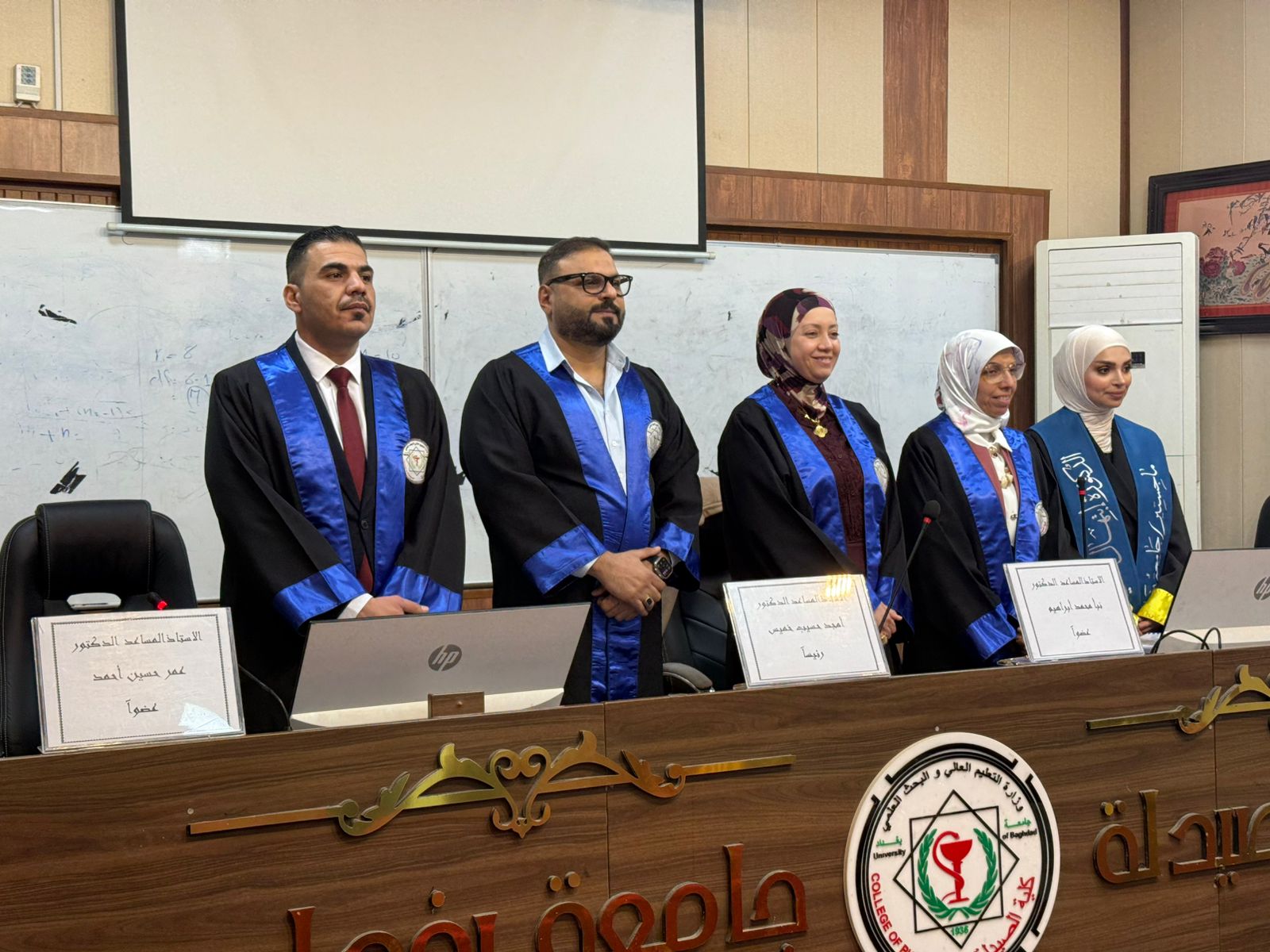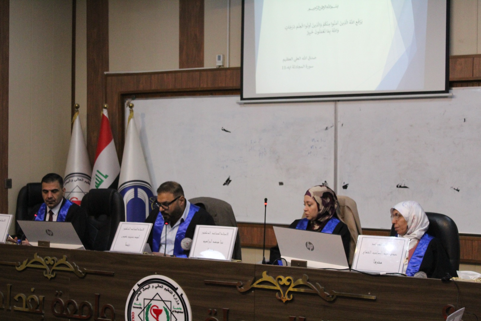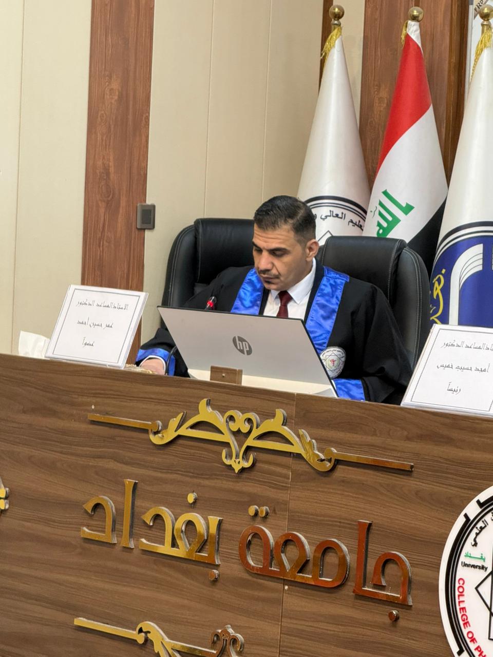 وقد أجريت المناقشة في تمام الساعة التاسعة من صباح يوم الاثنين الموافق 2026/2/23، على قاعة الرازي في كلية الصيدلة جامعة بغداد.