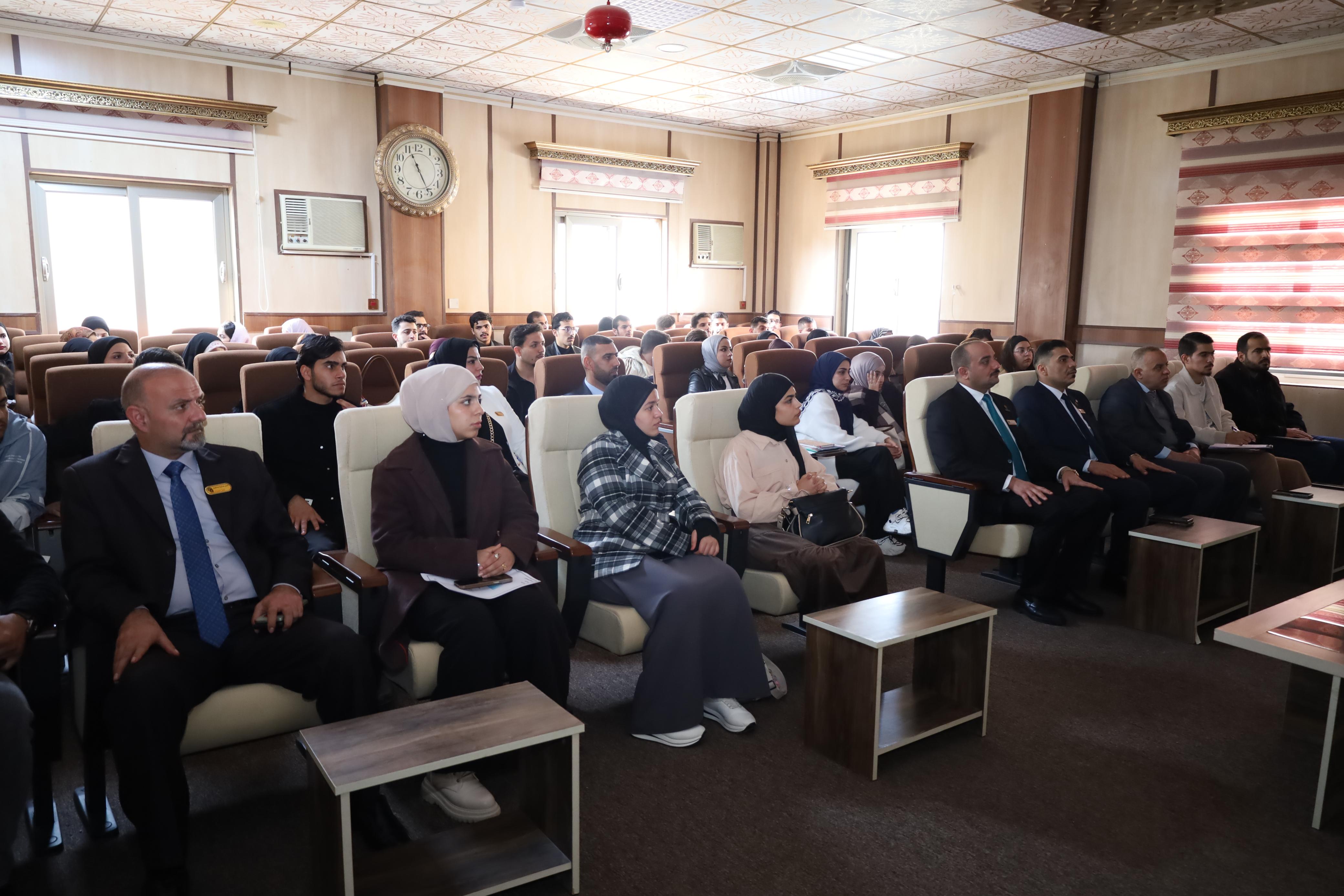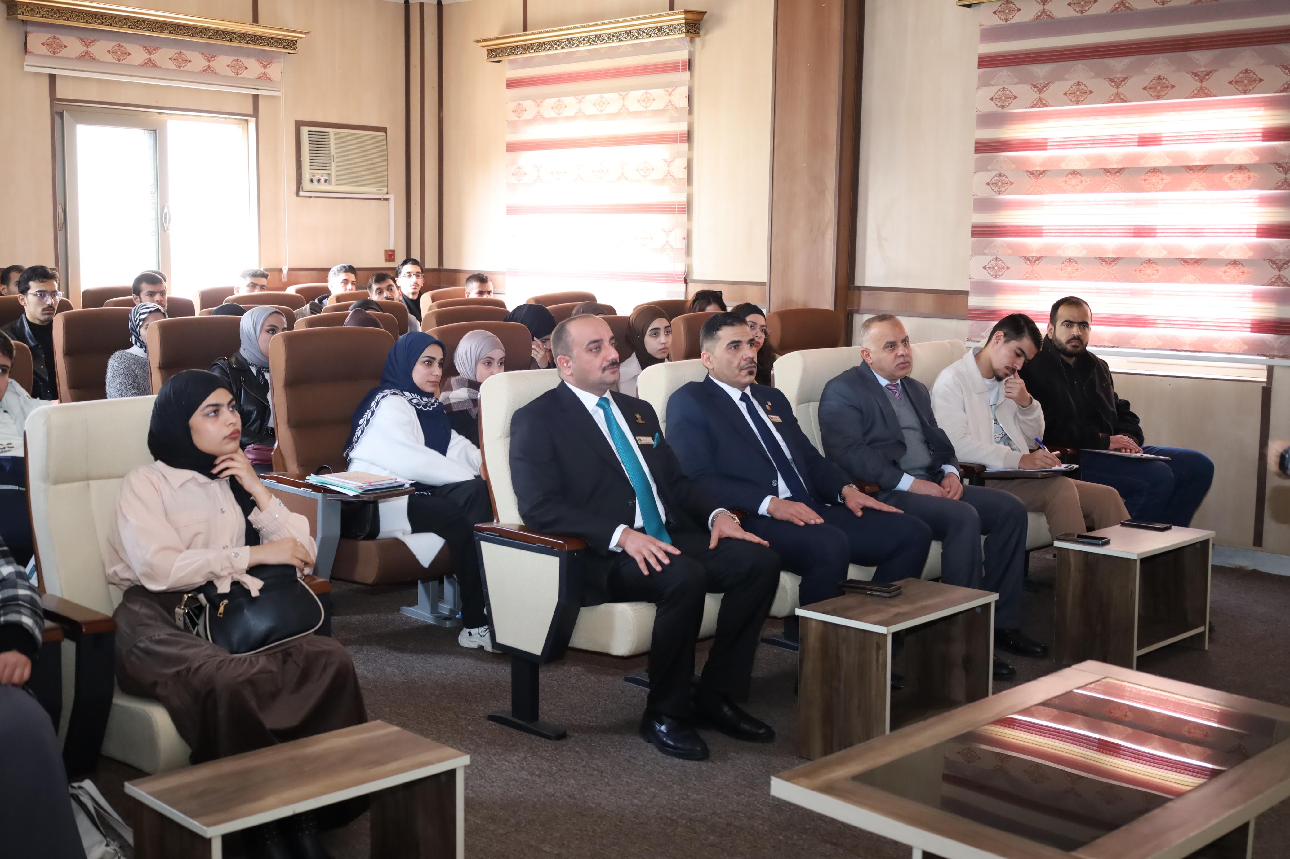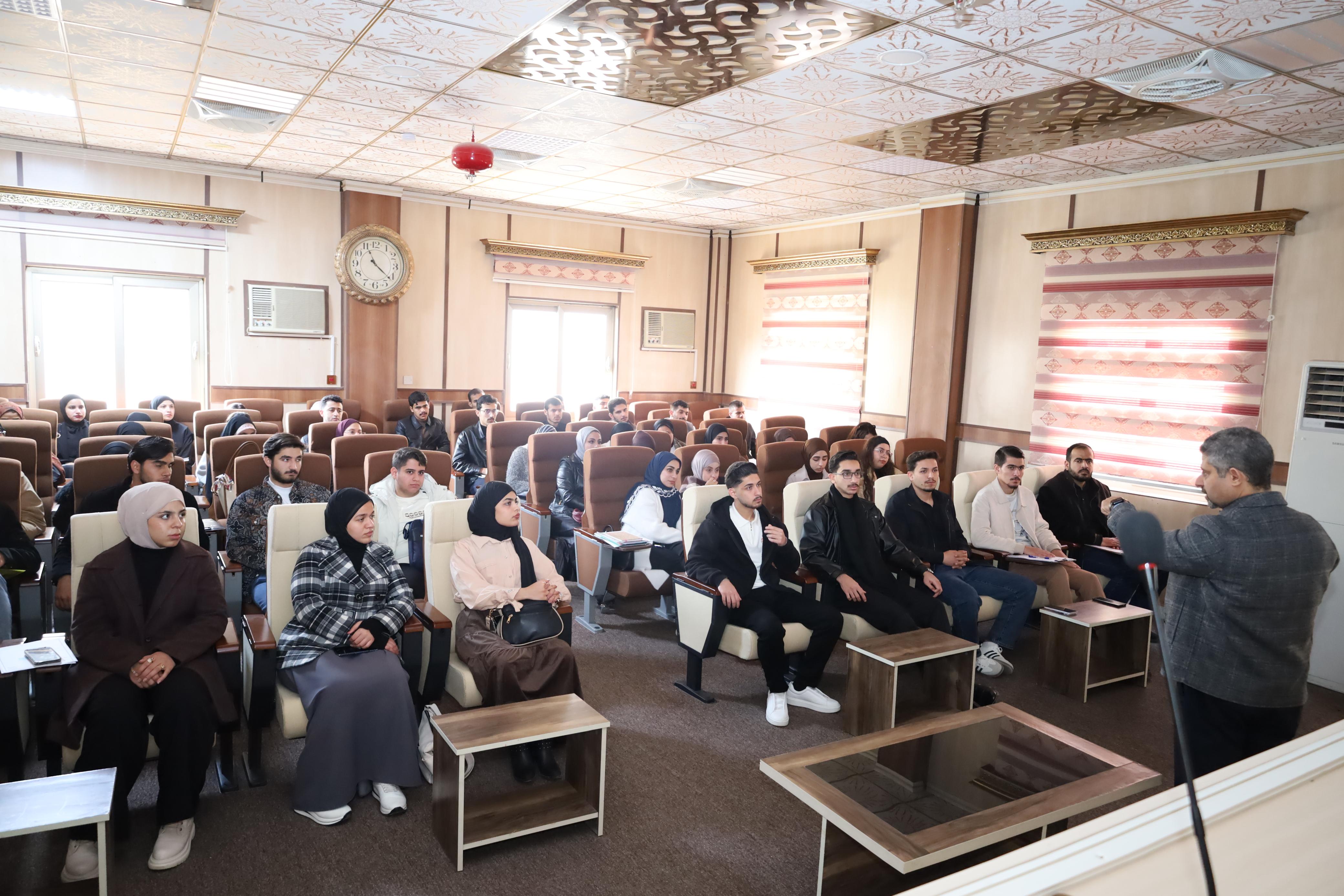 واستهل اليوم الأول بمحاضرة قدمها الاستاذ المساعد الدكتور سنان محمد عبدالله، تناول فيها مفهوم القيادة، وصفات القائد، والتطوير الشخصي في ريادة المستقبل والأعمال والابتكار، بوصفها مرتكزات أساسية للانخراط في سوق العمل.