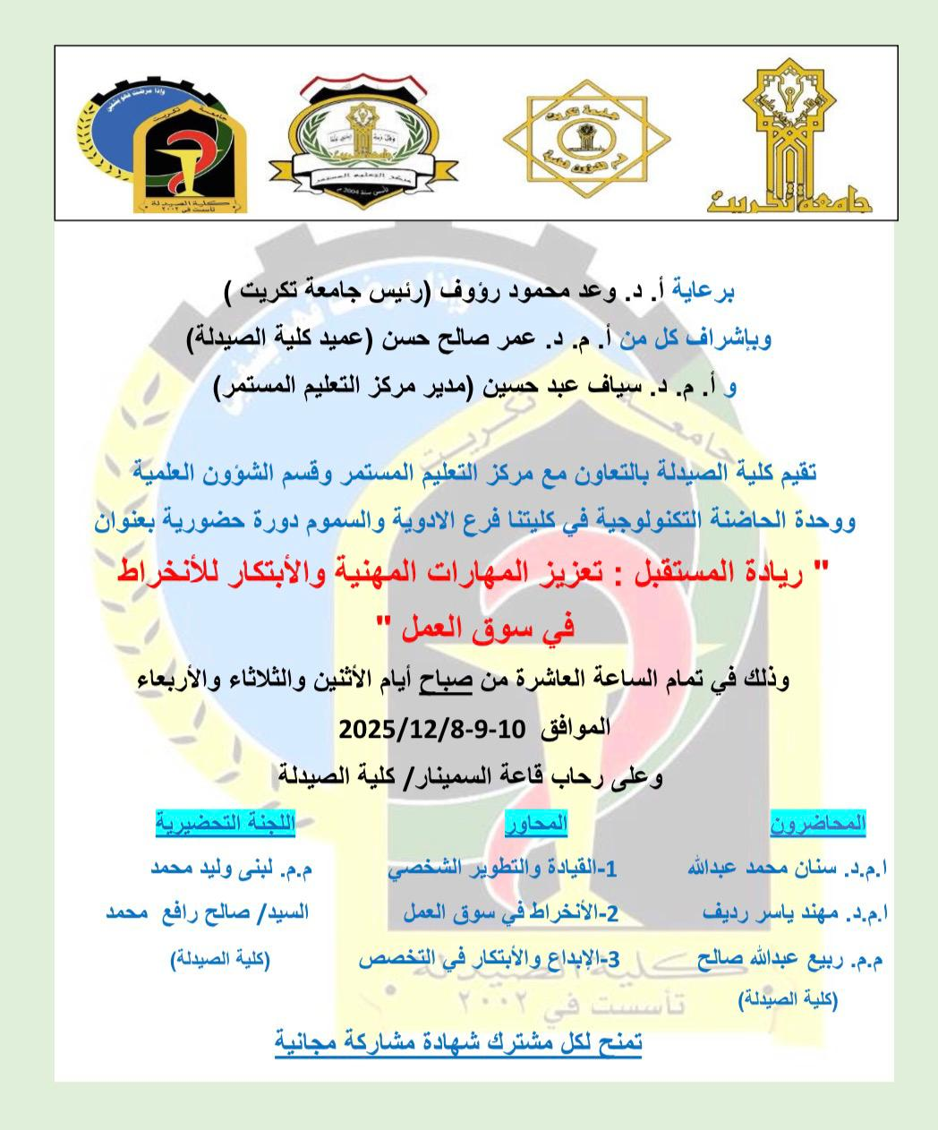 استناداً إلى توجيهات السيد رئيس جامعة تكريت الأستاذ الدكتور وعد محمود رؤوف المحترم، وبإشراف ومتابعة السيد عميد كلية الصيدلة الأستاذ المساعد الدكتور عمر صالح حسن المحترم