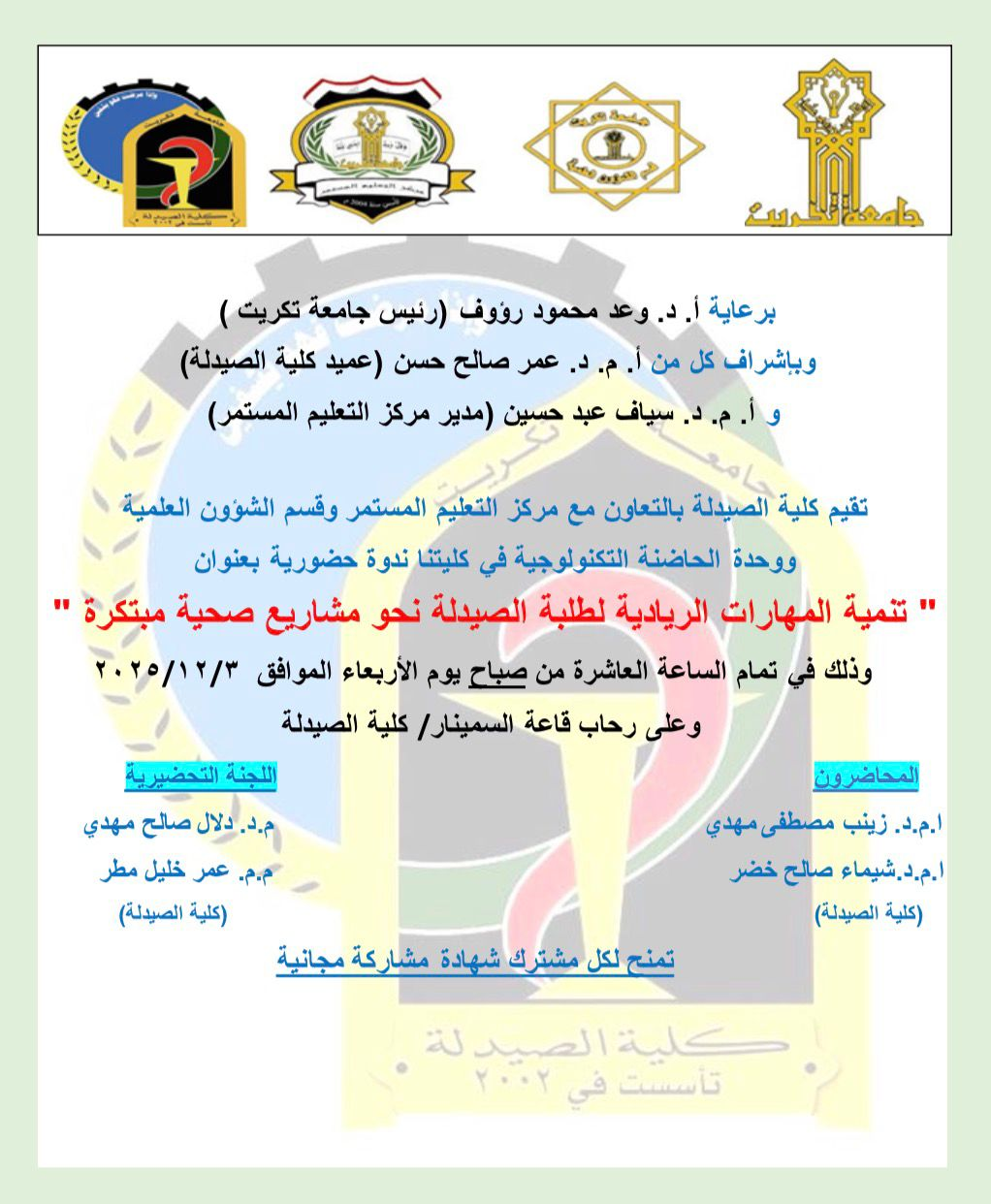 استناداً إلى توجيهات السيد رئيس جامعة تكريت الأستاذ الدكتور وعد محمود رؤوف المحترم، وبإشراف ومتابعة السيد عميد كلية الصيدلة الأستاذ المساعد الدكتور عمر صالح حسن المحترم