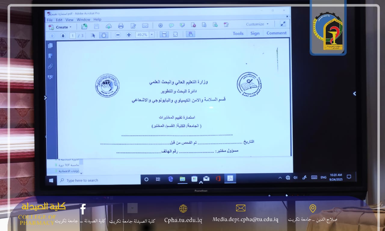 وتأتي هذه الدورة ضمن برامج جامعة تكريت وكلية الصيدلة الرامية إلى رفع مستوى الوعي والتأهيل والتدريب في مجالات السلامة والأمن الكيميائي، بما ينسجم مع متطلبات الجودة ومعايير السلامة الدولية.