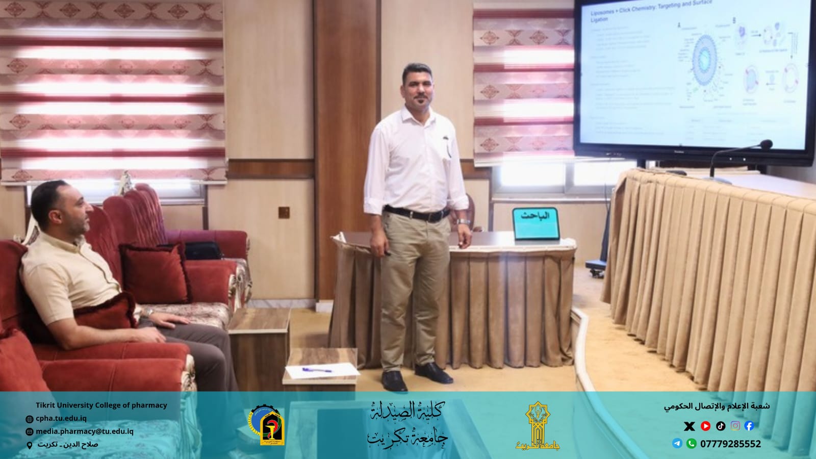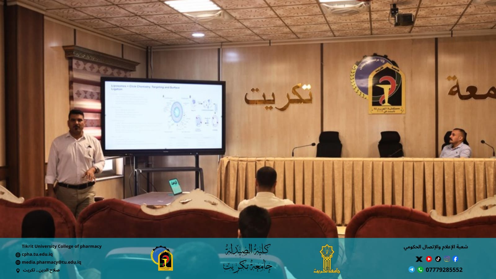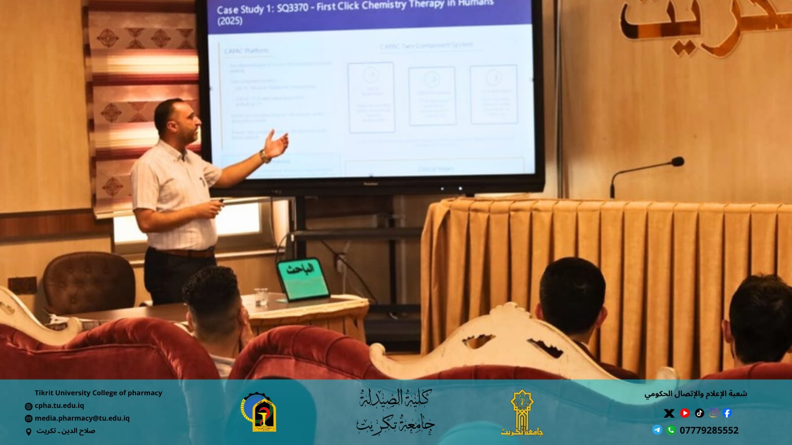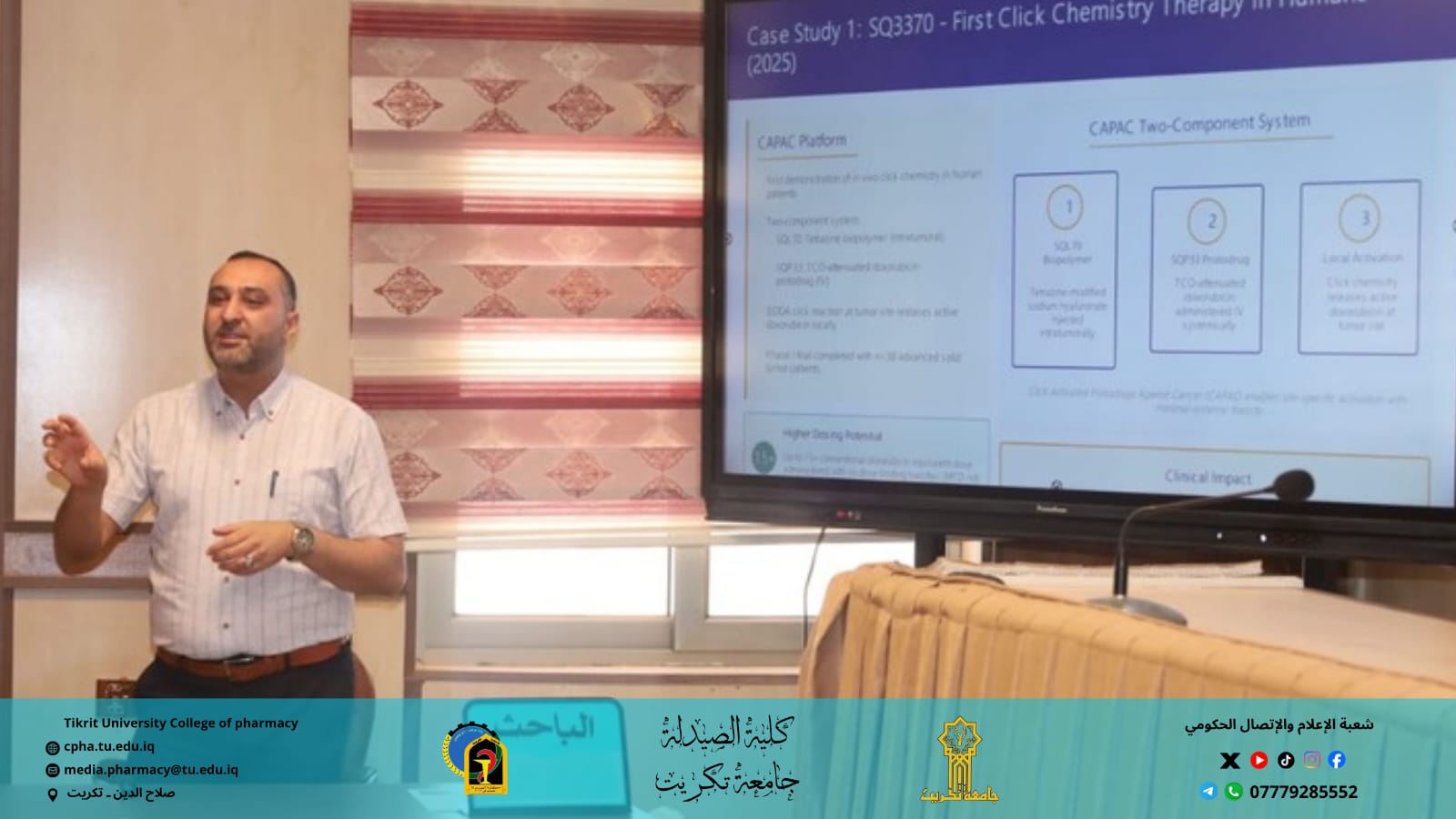 في اليوم الأول: م.د. يحيى سعد ياسين محاضرة تعريفية حول المبادئ الأساسية لتفاعل الـ Click Chemistry وأهميته في مجال الكيمياء الدوائية.