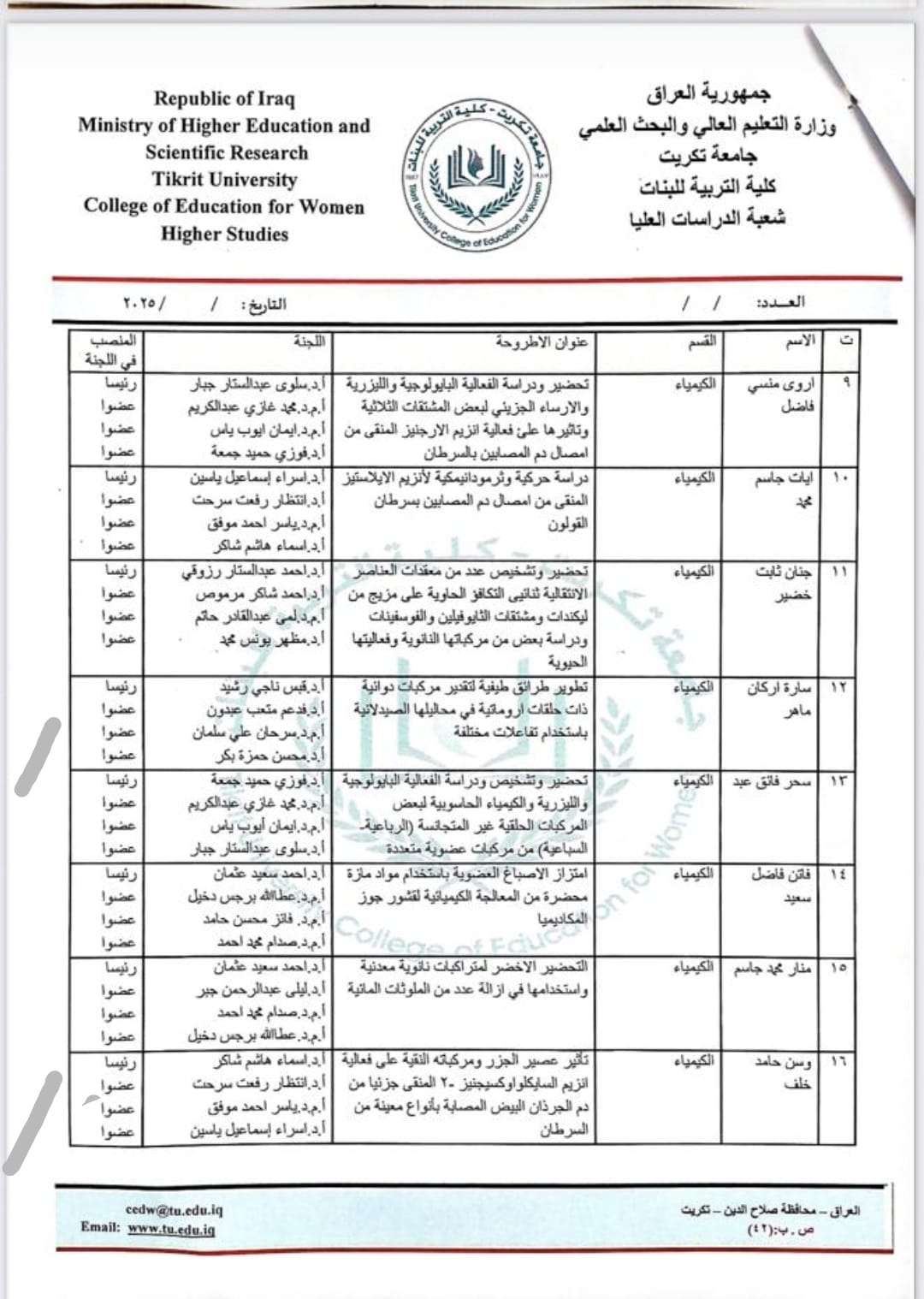 فيما شارك الدكتور ياسر أحمد موفق سليمان عضواً في لجنة الامتحان الشامل للطالبة آيات جاسم محمد في أطروحتها الموسومة: "دراسة حركية وثرموديناميكية لإنزيم الإيلاستيز المنقّى من أمصال دم المصابين بسرطان القولون".